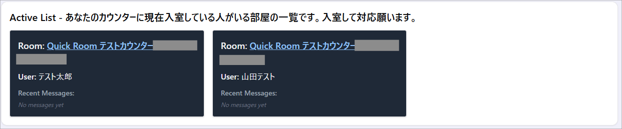 「Active List」に、入室している人がいるカウンタールームの一覧が表示されます。自分か共有している人に顧客対応をします。デスクトップ通知もあるので、漏れずに顧客対応が可能です。